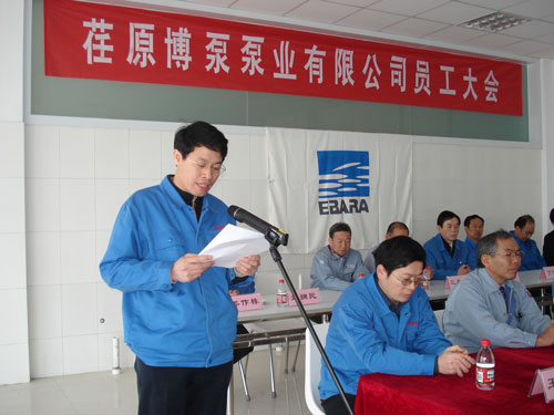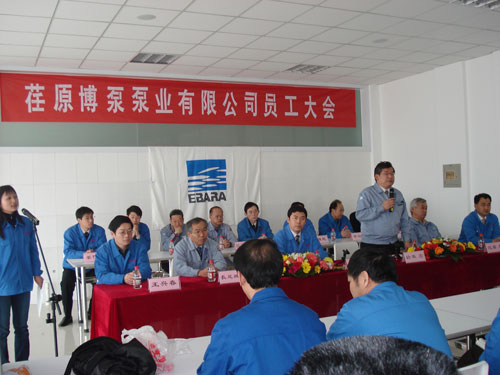 公司常務副總經理鈴木宏先生主持大會并感謝大家經過各方面的努力,使公司建成投產。人力資源部部長姜作棟先生將公司機構設置、部門人員安排及請假制度等作了介紹;總經理助理、公司辦公室主任劉擁民先生將公司員工行為準則作了介紹;最后,總經理孫龍平先生講話,孫總談到:荏原博泵泵業有限公司是日本荏原制作所與山東博泵科技股份有限公司的強強聯合。1912年做為泵的制造商起家,隨后發展成為工業機械界帶頭企業的日本荏原以其雄厚的技術實力,成為世界最大的單一泵制造廠家。而成立于1929年的山東博泵科技股份有限公司,在70多年專業生產水泵的基礎上,成為中國泵行業的佼佼者,并建立了遍布全中國的銷售網絡。荏原博泵泵業有限公司的建成投產,將在優勢互補的基礎上,發展成為高科技、高品質的世界級一流企業。